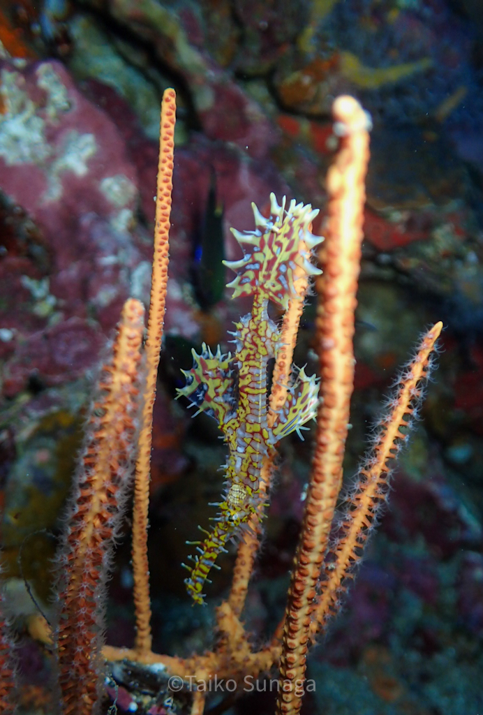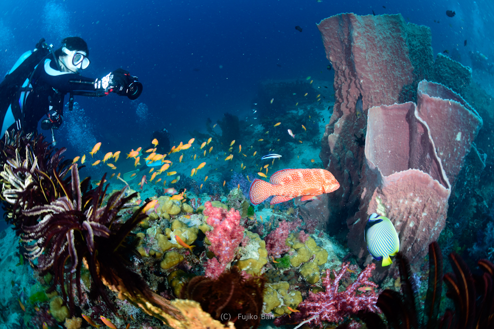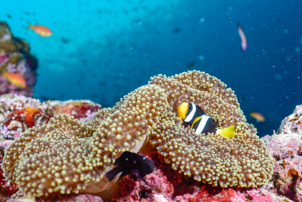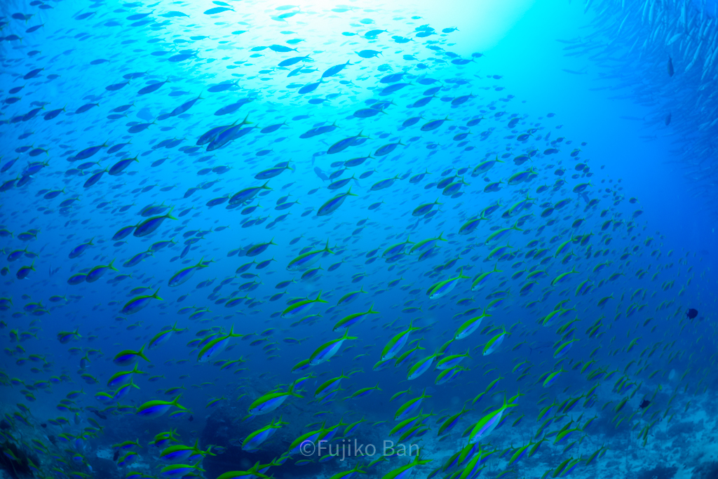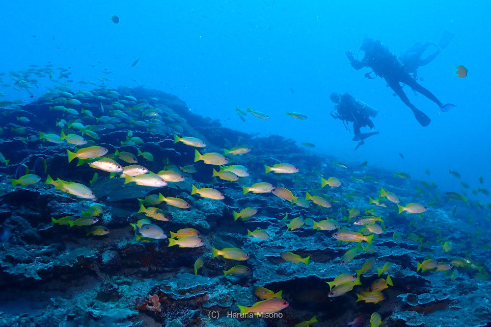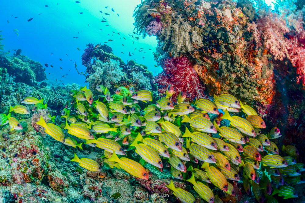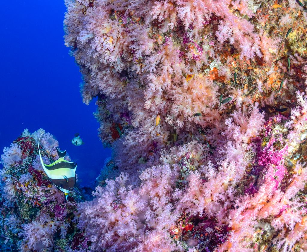 黄色いソフトコーラルがモリモリなポイントなので、バラクーダの下でこんなのも撮っていただきました!