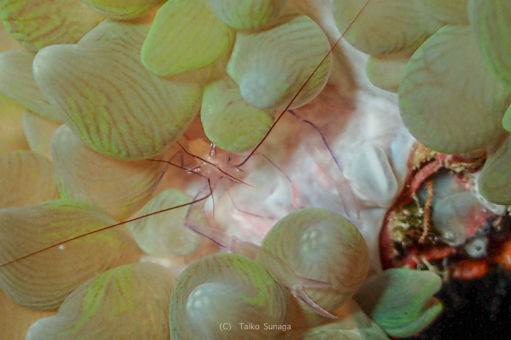 よーく見ると、イソギンチャクモエビがフリソデエビの足元に。。。