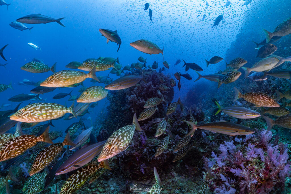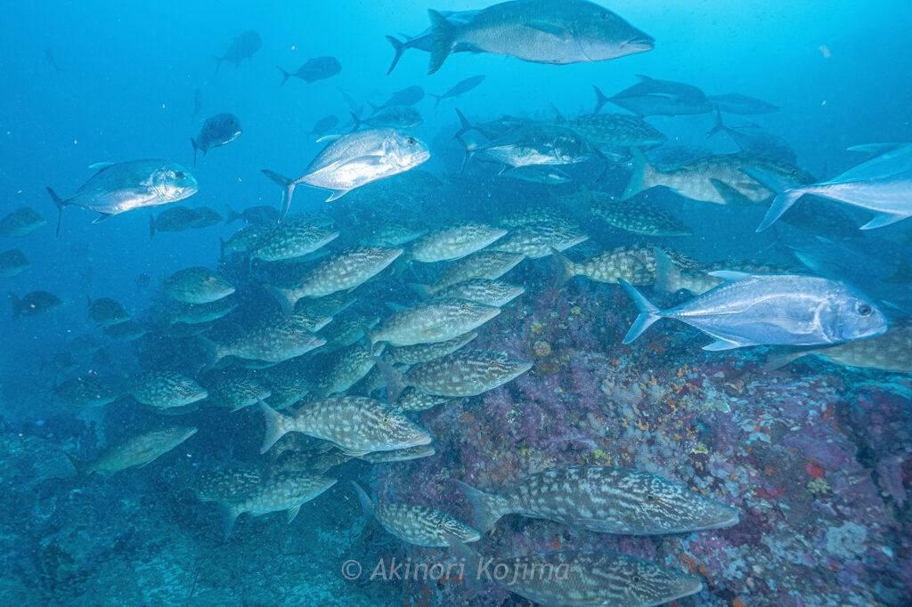 無数のヒメタカサゴの群がりにロウニンアジが突っ込んできます!