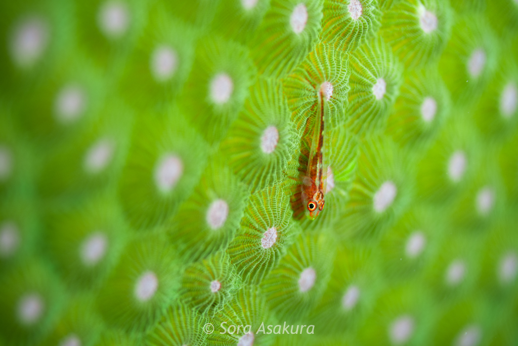 綺麗な色のダイオウサンゴに乗るセボシウミタケハゼ。