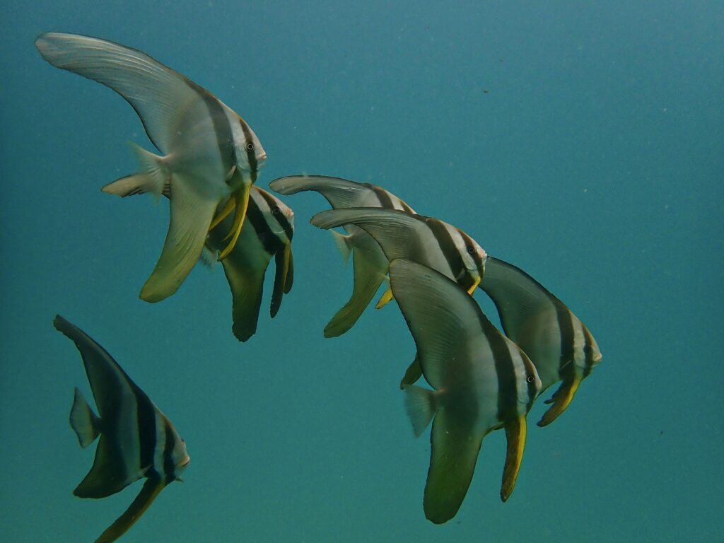 潜るとすぐブイ下にかわいいツバメウオの子供達♥️