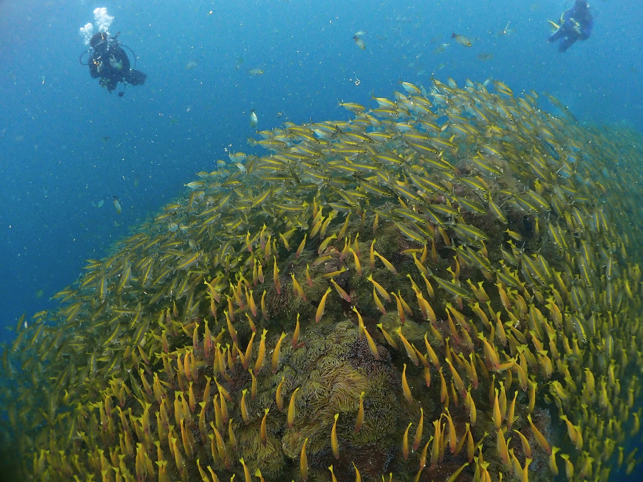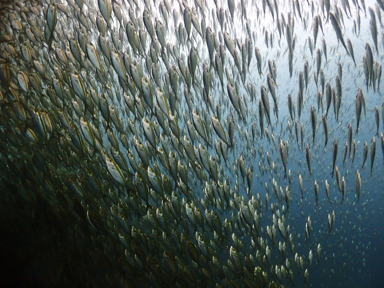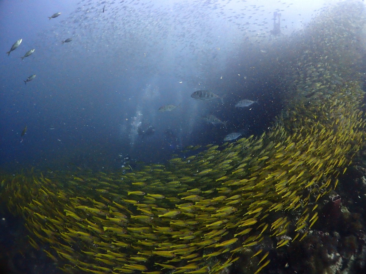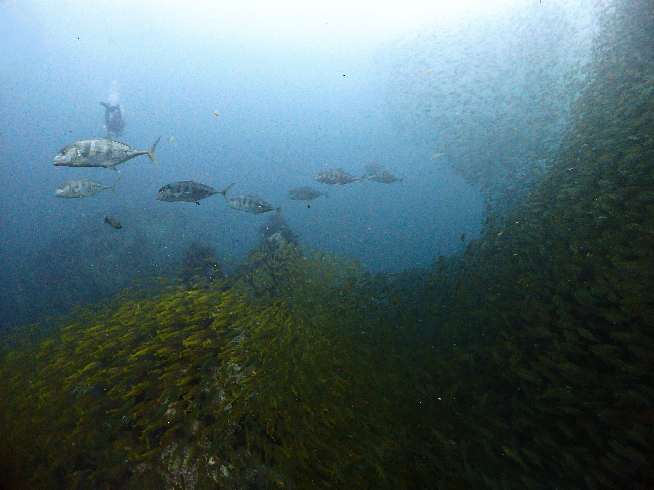 そこへテルメアジの大群が合流し、視界一面が魚でいっぱいに。