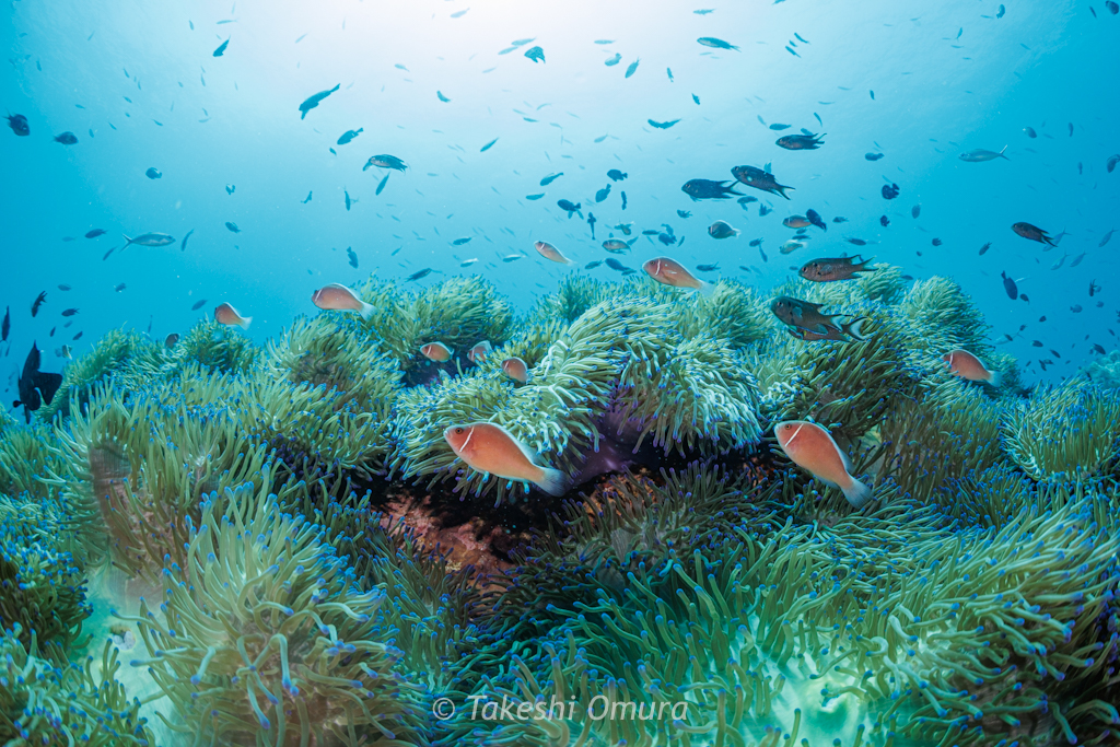 まずは名物のセンジュイソギンチャクとハナビラクマノミの大群生。