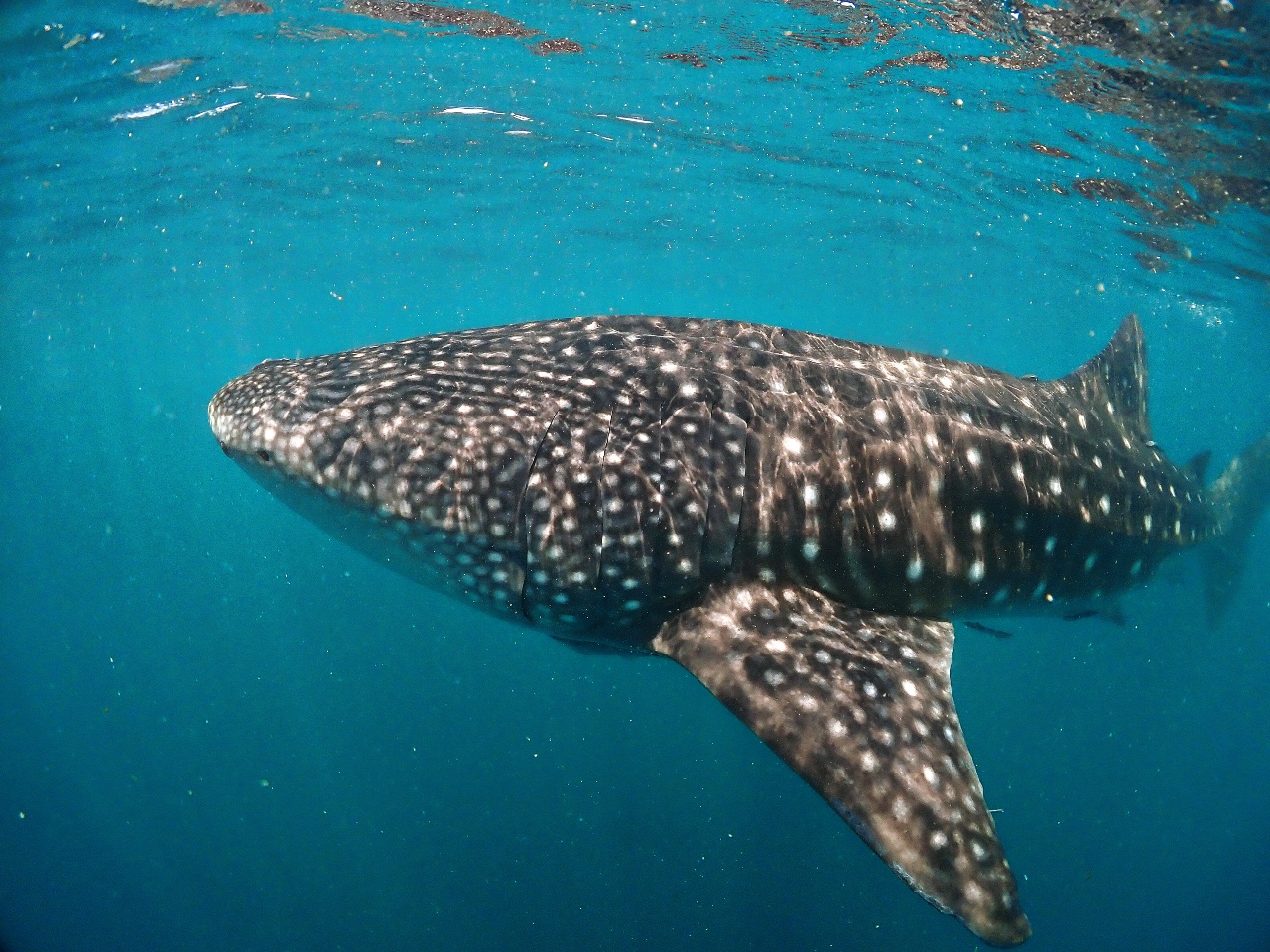 水面に顔を上げると周りのボートの人たちが騒がしいく、あっちにジンベエ居るよー!!!