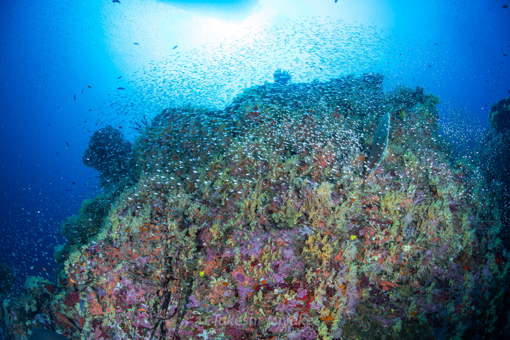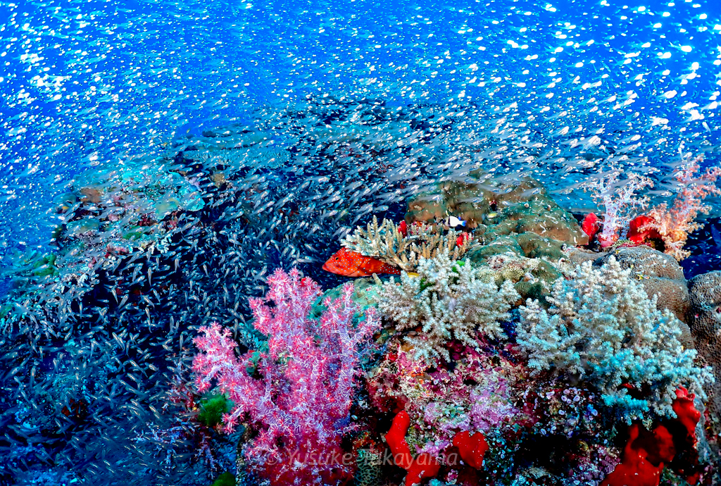 様々な種類と形のソフトコーラルにスカシテンジクダイやキンギョハナダイが群れています。