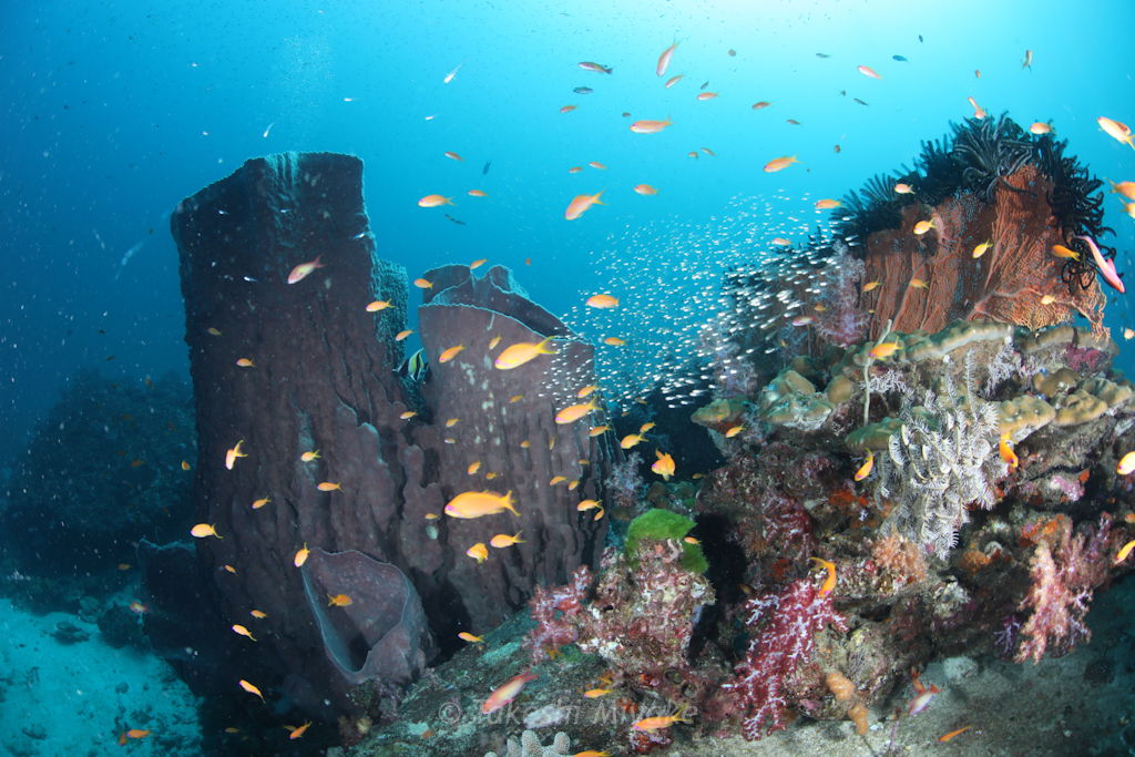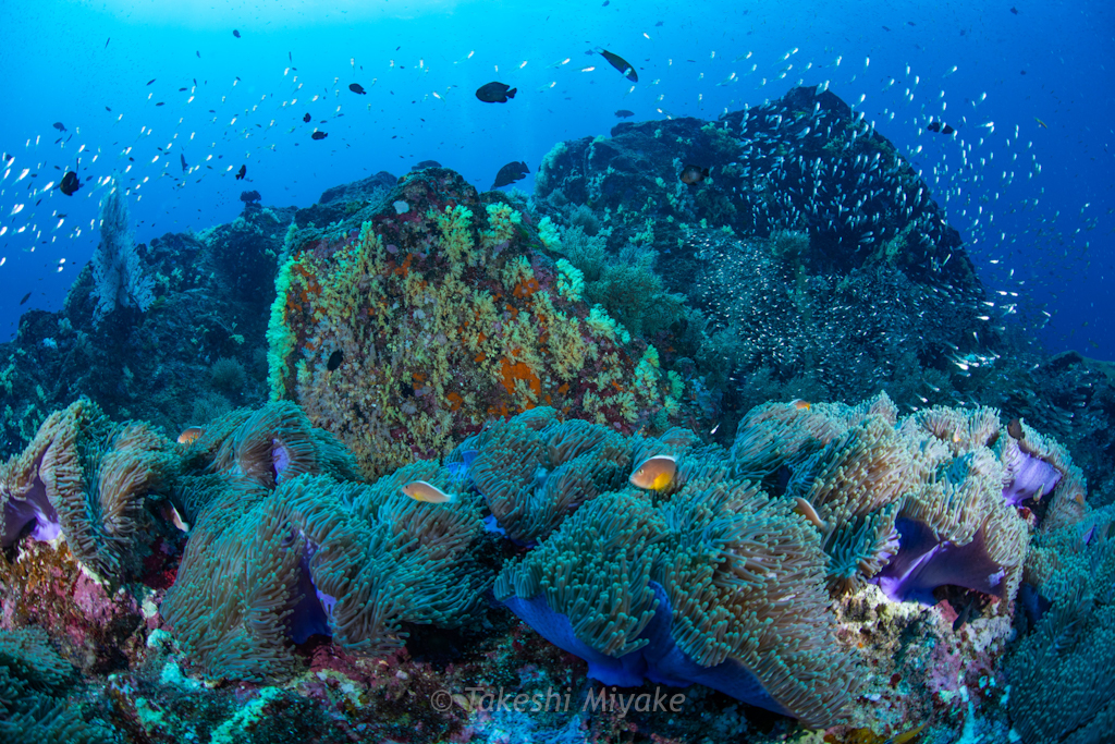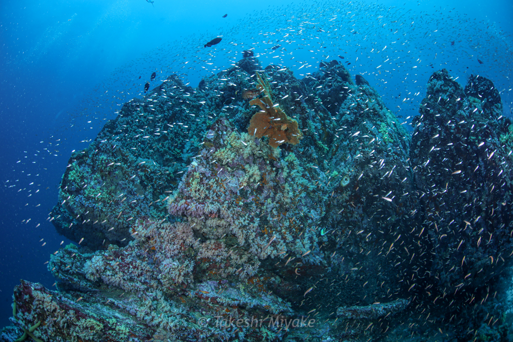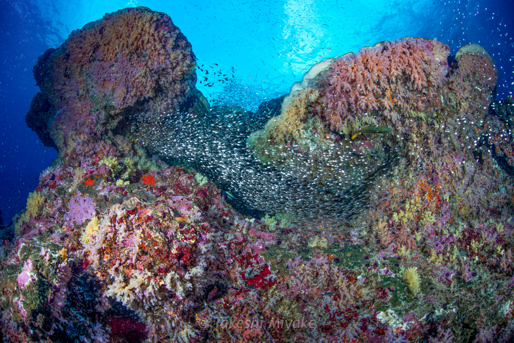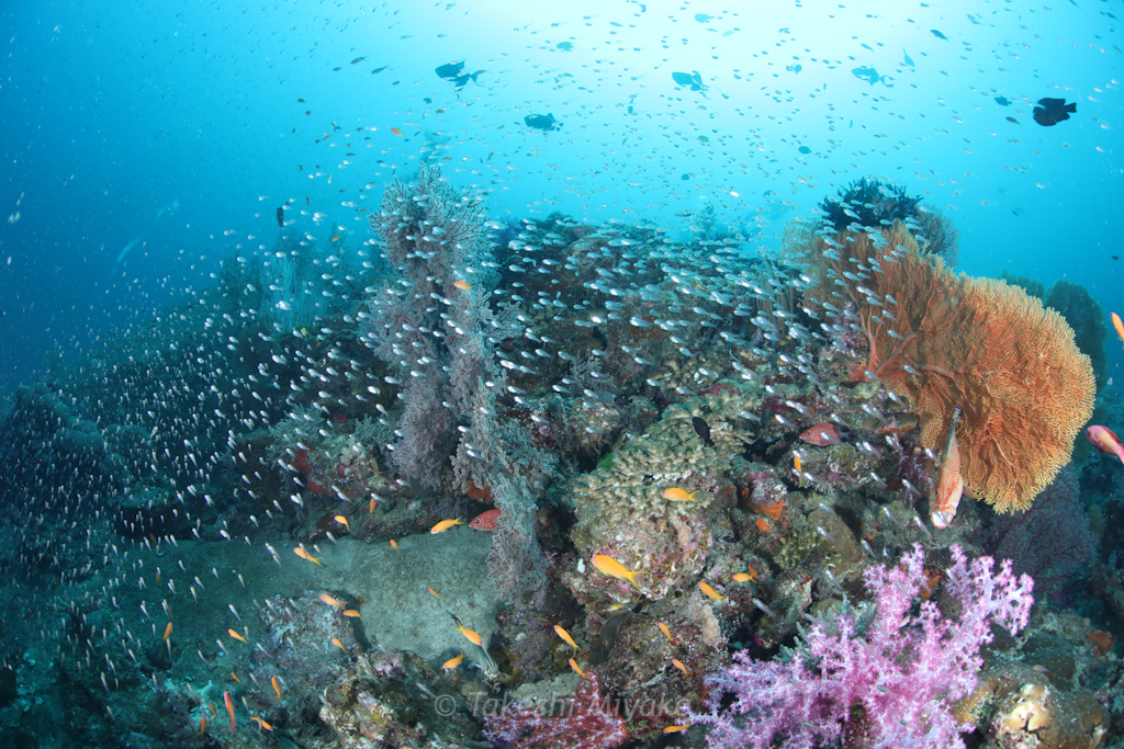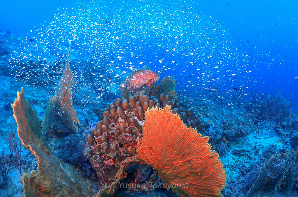 潮当たりの良い場所に生えているウミウチワの周りにはスカシテンジクダイやヤマブキスズメダイが着いています。