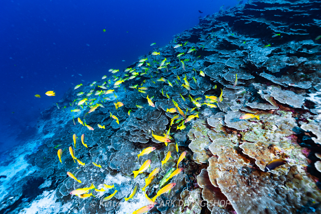 斜面にはキンセンフエダイが群れ、棚の上に登ればスカシテンジクダイがびっしり付いた根があります。