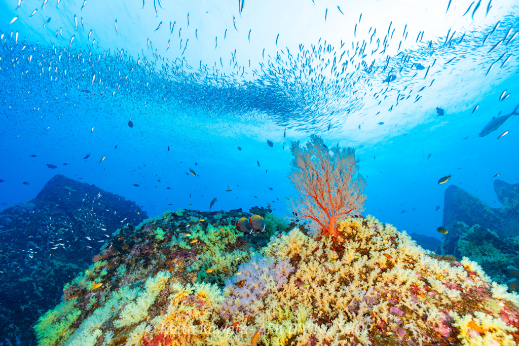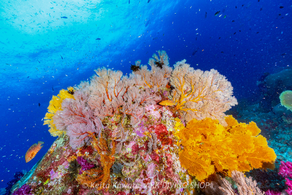 島の西側のダイナミックな岩の地形のポイントですが、別名を『ウミウチワの街』というこのポイントはウミウチワやイソバナがわんさか群生しています。