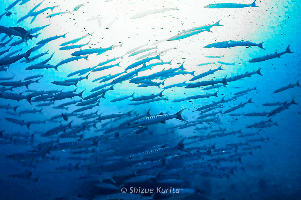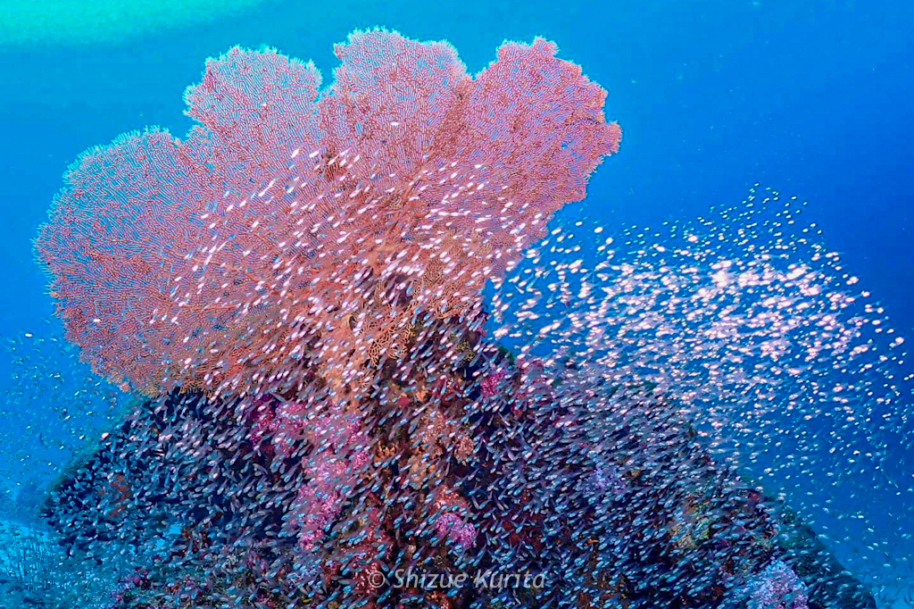 薄暗くなる海のなか、目の前に広がる無数のスカシテンジクダイが満天の星空のようで美しいです!