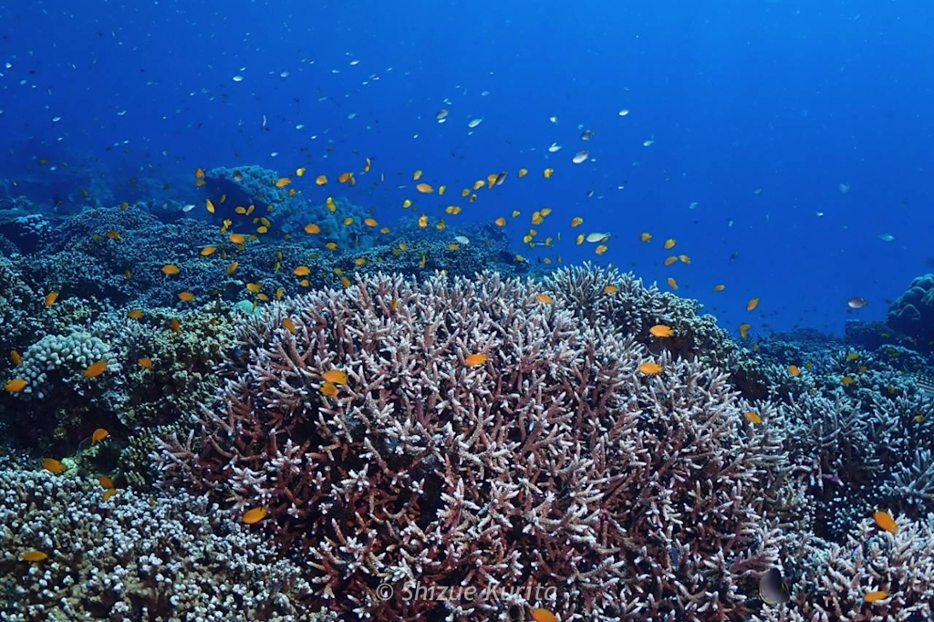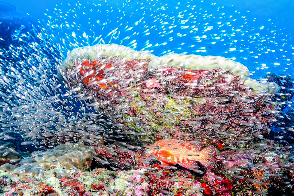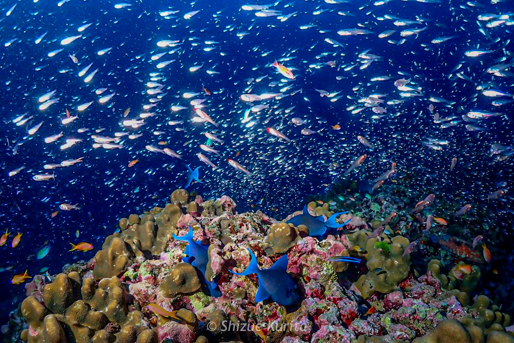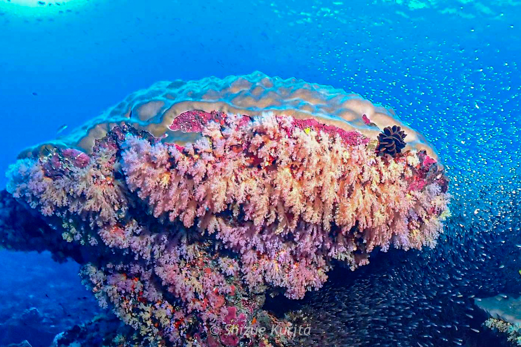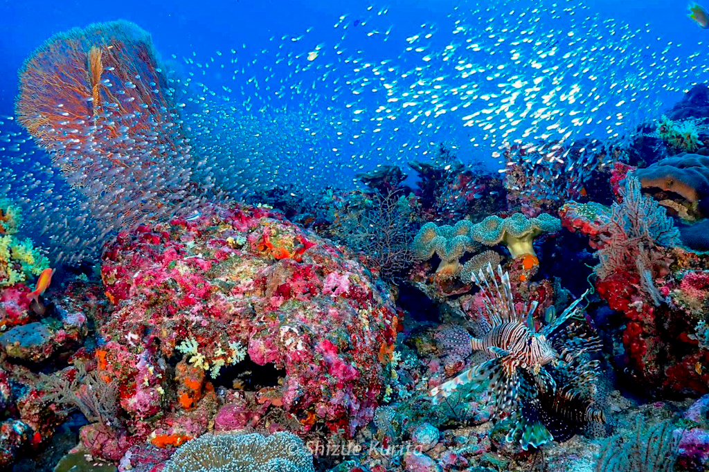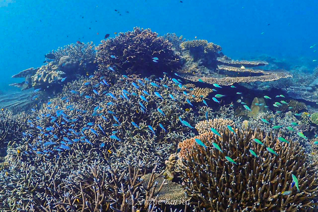 いろんな形のいろんな種類のサンゴ群にデバスメダイがいっぱい群れています!