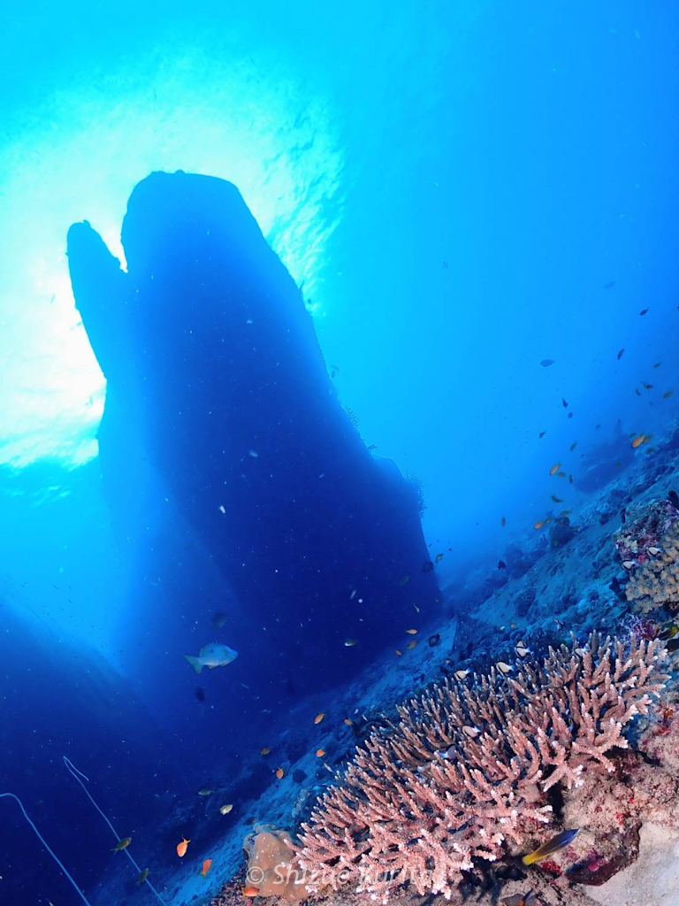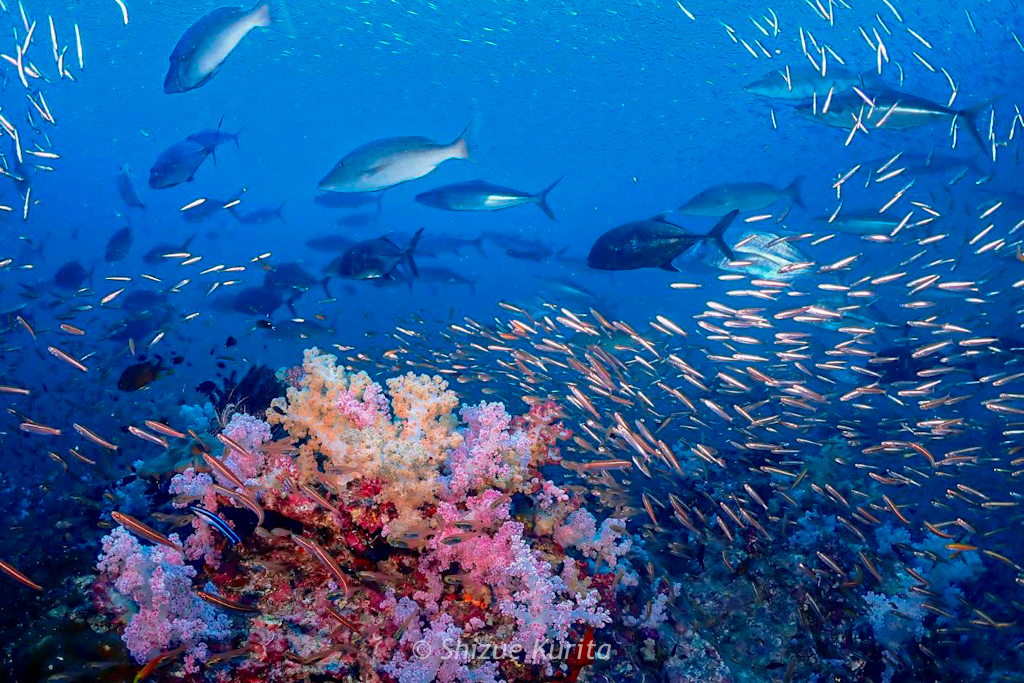 透明度は抜群で、スカシテンジクダイなどの小魚がますます増えてきていて、それを狙うカスミアジやキツネフエフキの軍団もど迫力の捕食シーンを展開していました。