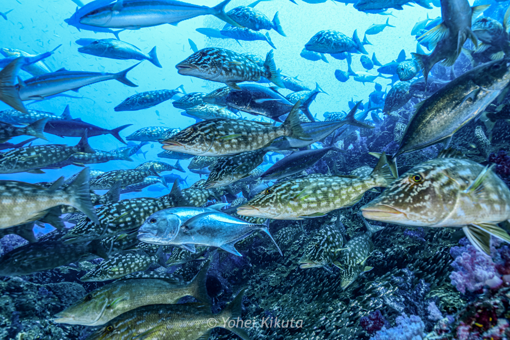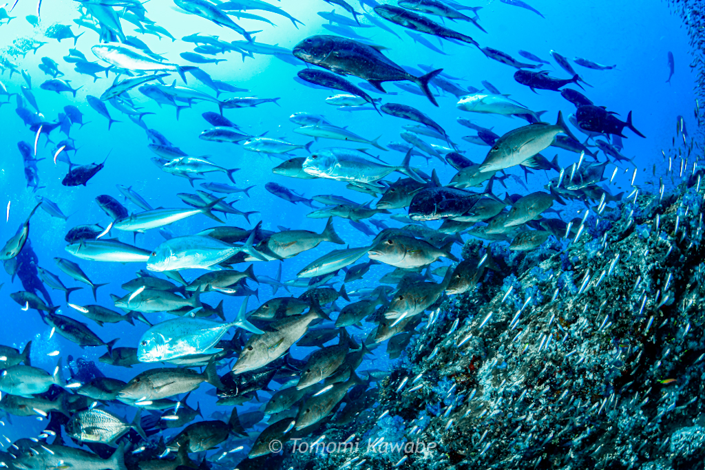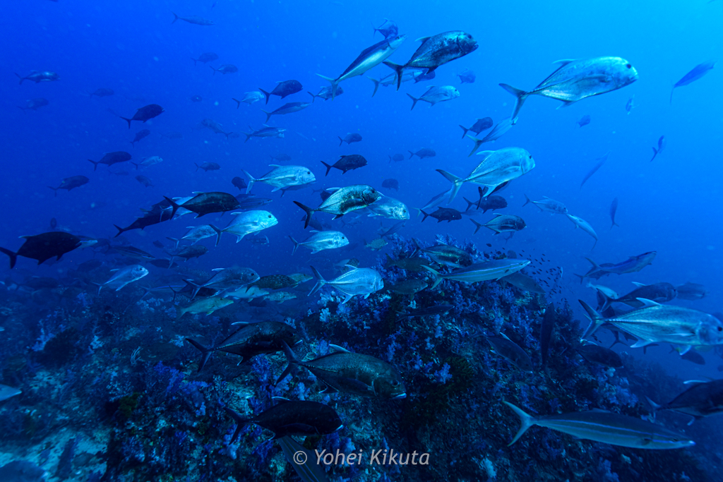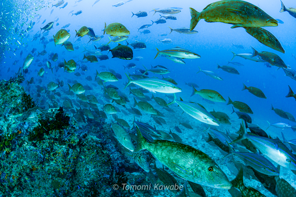 そして潮の当たる方へ泳いでいくと、ロウニンアジやカスミアジがたくさん登場します。