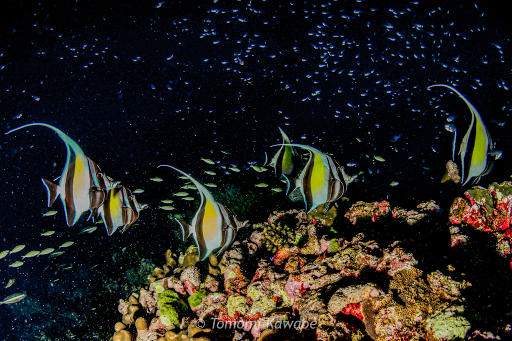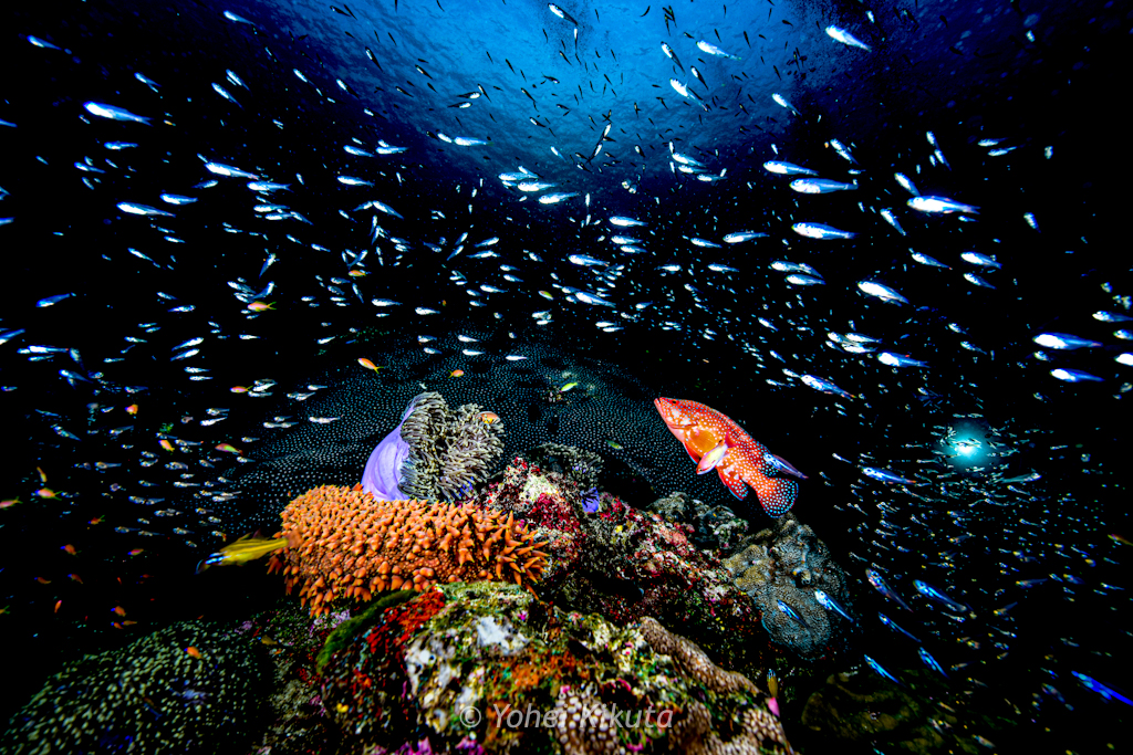徐々に暗くなっていく海に無数のスカシテンジクダイが散らばるため、光を当てると満天の星空のようになります。