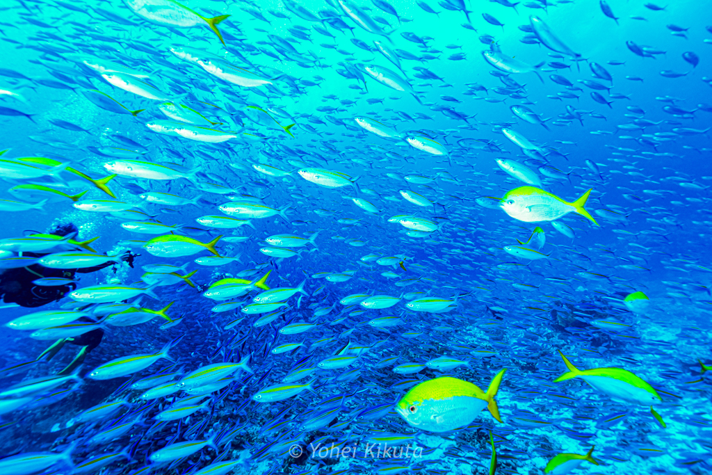 潜降してすぐ、目の前がまっ黄色になるほどのイエローバンドフュージュラーの群れが登場!
