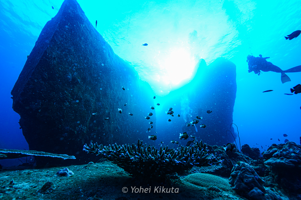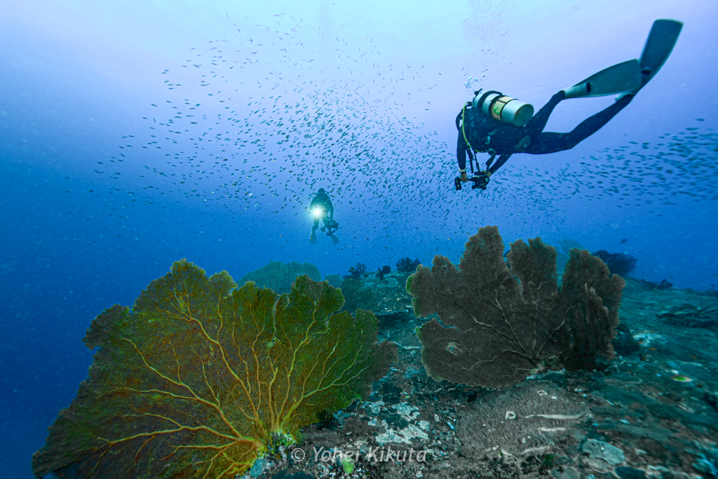 すぐ正面の斜面にはハードコーラルが並び、スカシテンジクダイやキンセンフエダイが群れています。