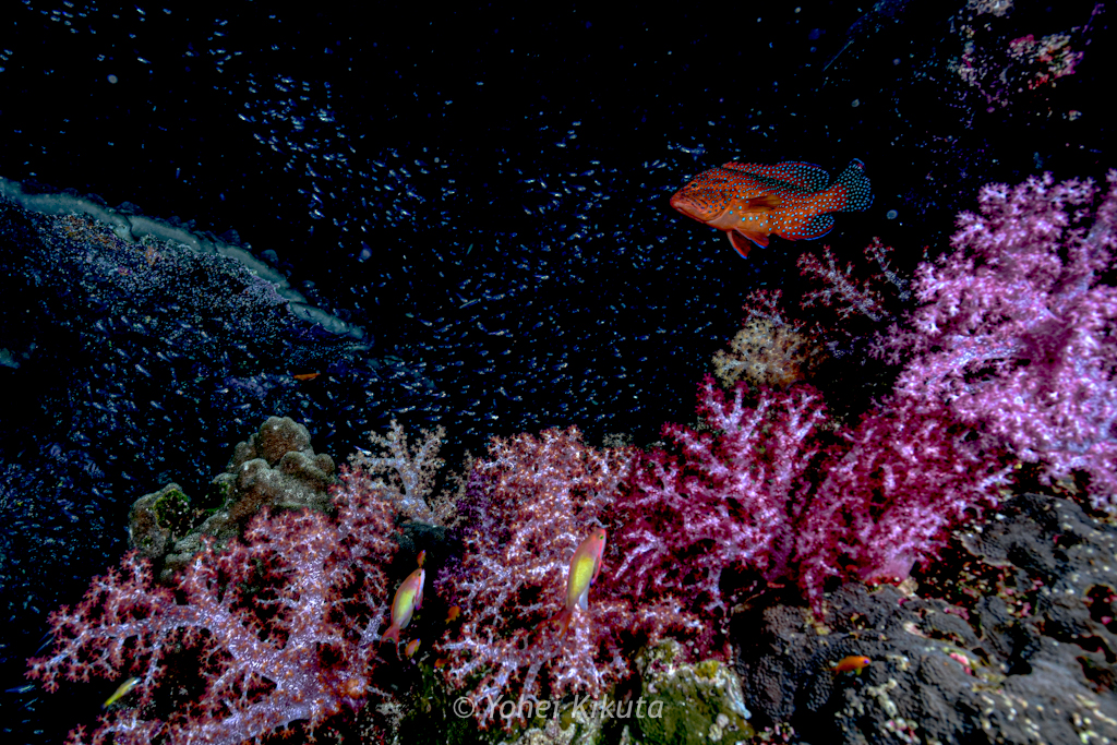 そして、たくさんいるスカシテンジクダイは夜行性なので、逆に中層へ向かって広がり始めます。