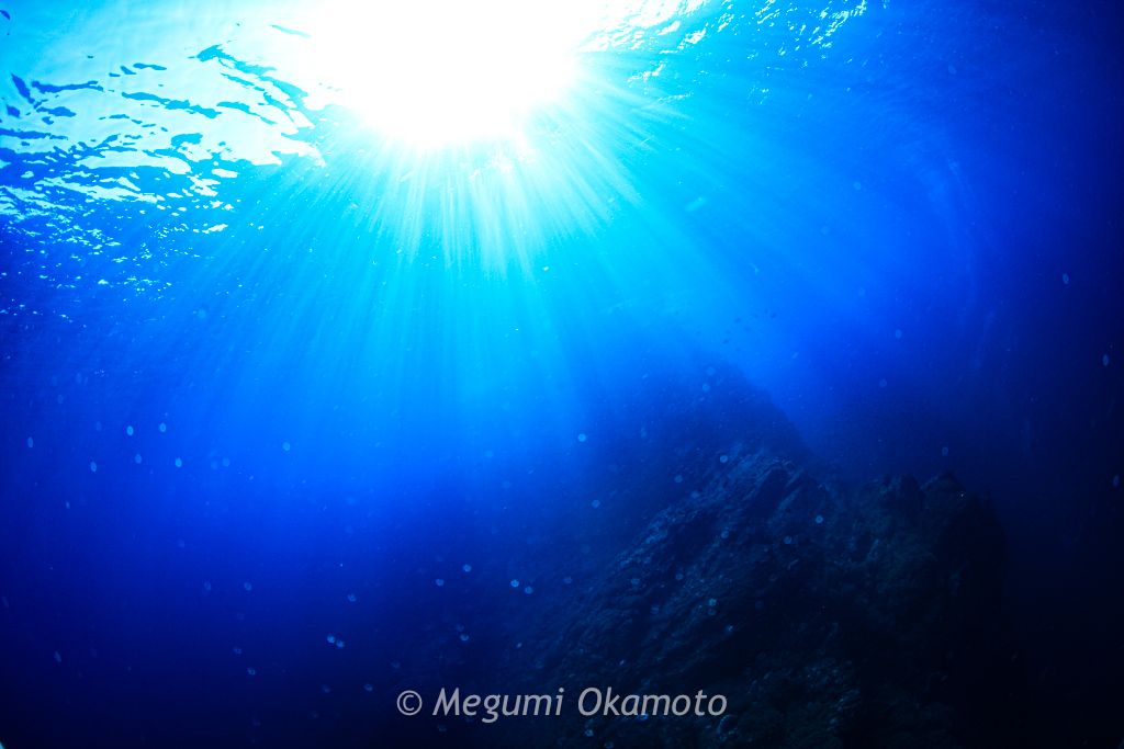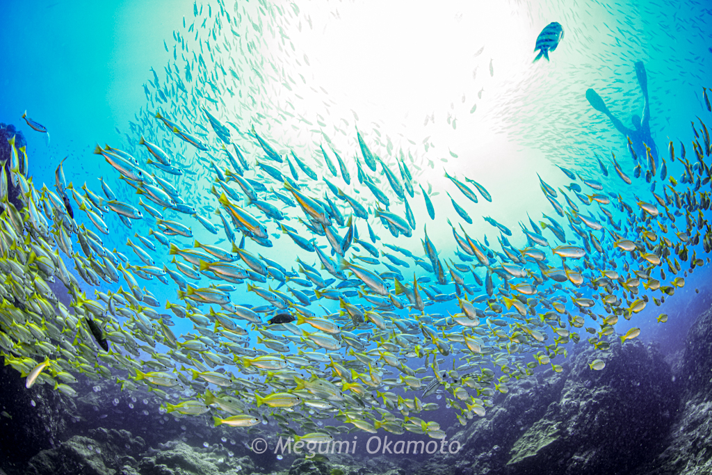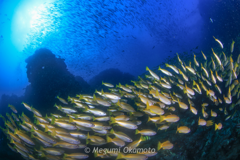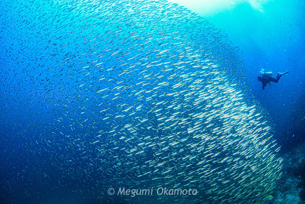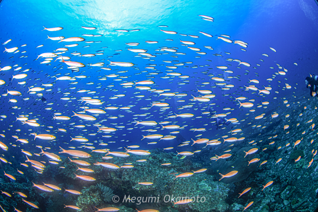 スカシテンジクダイがキラキラと輝く風景を見ながらのんびりと深場を目指して降りていきます。