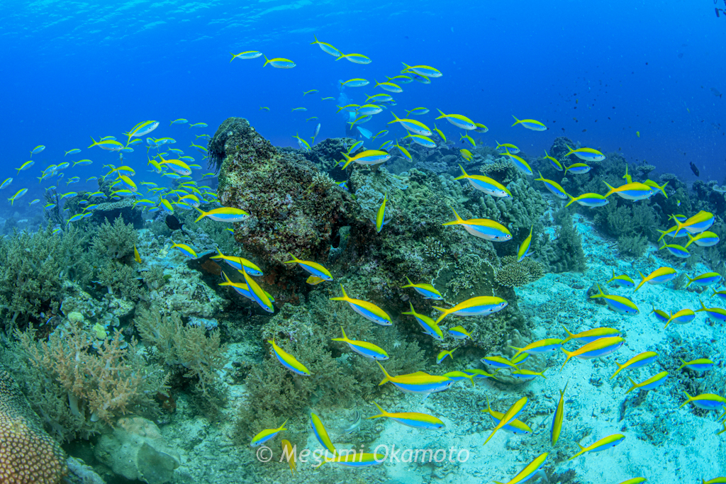 斜面にはヨスジフエダイやキンセンフエダイが、中層はブラックピラミッドバタフライフィッシュが群れていました。
